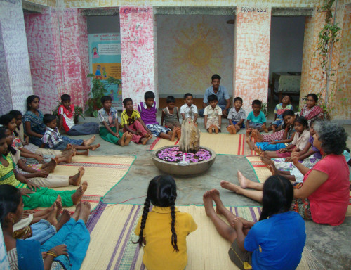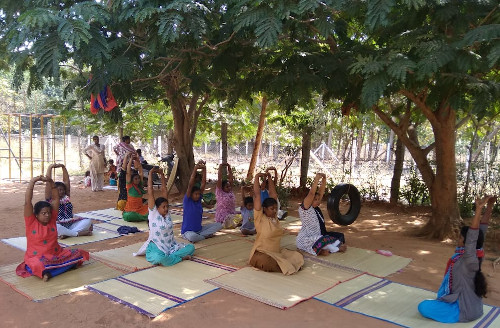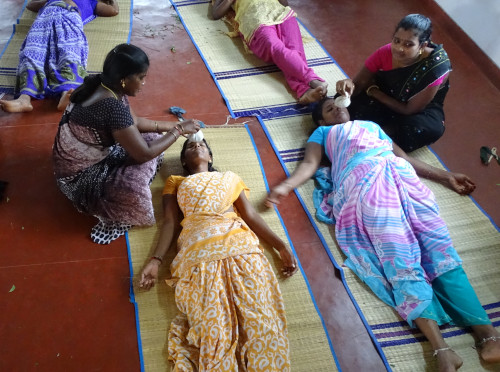 This program is designed, managed and delivered by Muthukumari, a qualified yoga teacher who has over 15 years of experience delivering health programs to villagers through Auroville Health Services and the Edayanchavadi Healing Center (a former Thamarai Project). Muthukumari, originally from one of the local villages, delivers yoga classes that integrate principles of primary health care, nutrition, the body’s physical and energy systems and healing in educational sites in the villages surrounding Auroville. A curriculum is used that participants can then continue with as they step up to lead the group.